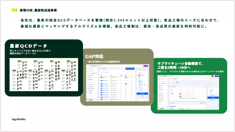 このプラットフォームを使えば、たとえばある食品工場さんから数十トンのキャベツの発注をいただいた際に、いろんな農家さんが自動でマッチングされるようになります。それぞれの生産状況や過去に出荷した農産物の品質、契約の履行率、単価などあらゆるデータが入力されているので、発注内容に対応で きる農家さんが自動で抽出される仕組みです。
