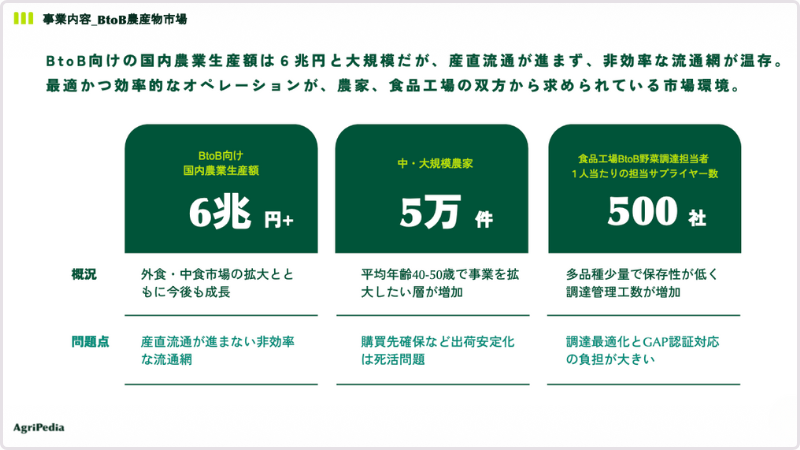 BtoBの農産物市場は、外食や中食需要の拡大で市場は成 長しているものの、流通網の整備が進んでいない課題がありました。農家さんとしては事業を拡大するために販売先を増やしたいニーズがあり、食品工場としては調達の安定化や調達管理コストを削減したいというニーズがありました。私たちがハブになることで、これらを実現していきたいと考えています。