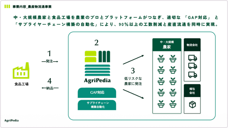 この事業をメインに、目指しているのは食品工場と大規模農業法人の間に私たちが入り、ムダを削減した高品質な流通を実現するモデルです。