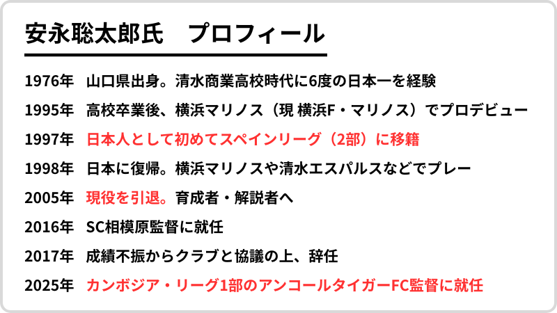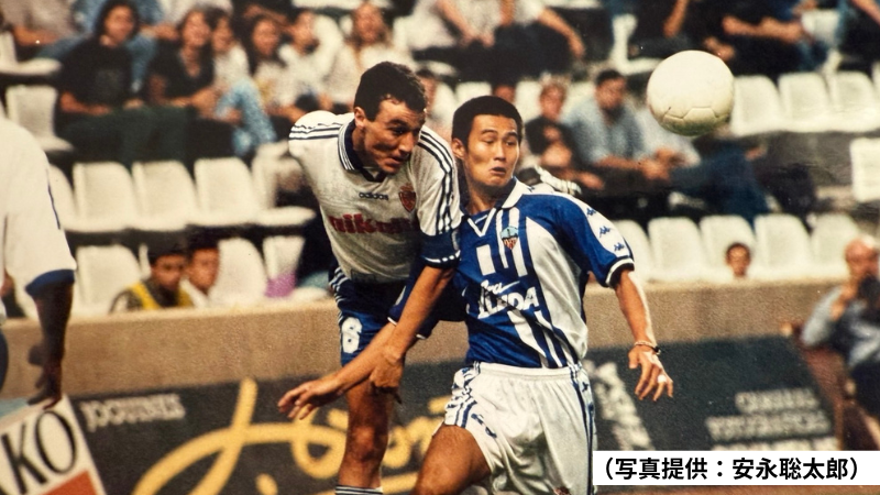 安永聡太郎氏は、そのプロセスをサッカーという舞台で体現してきた人物だ。横浜マリノス(現 横浜F・マリノス)でプロのキャリアをスタートさせ、早くから海外に挑戦。日本人として初めて、スペインリーグ(当時2部)の公式戦でプレーした経験を持つ(※)。その後も複数クラブで選手として活躍し、現役引退後は指導者へとキャリアをシフトしていく。