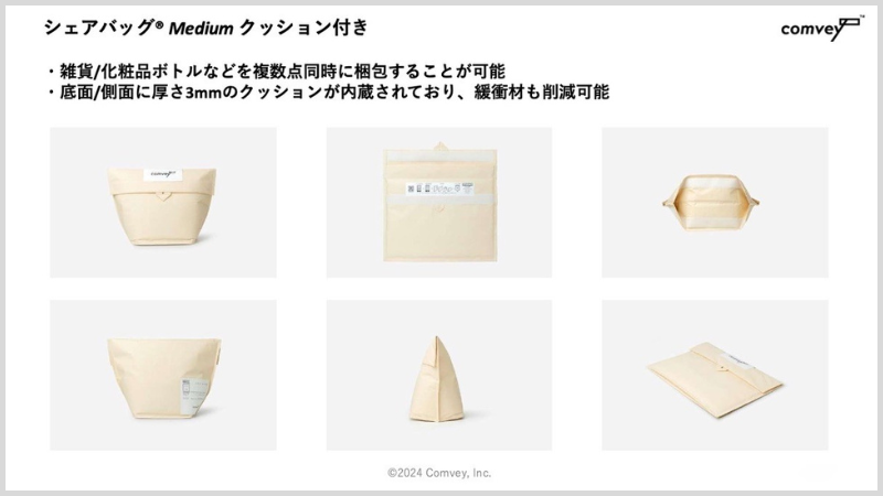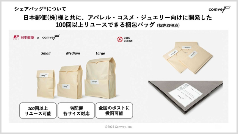 これは日本郵便さんと共同で開発したもので、オンラインストアでアパレルやコスメ、ジュエリーなどを購入する際、『シェアバッグ』で商品が届きます。現在30ほどのブランドに導入いただいていて、導入準 備中のブランドもたくさんあります。