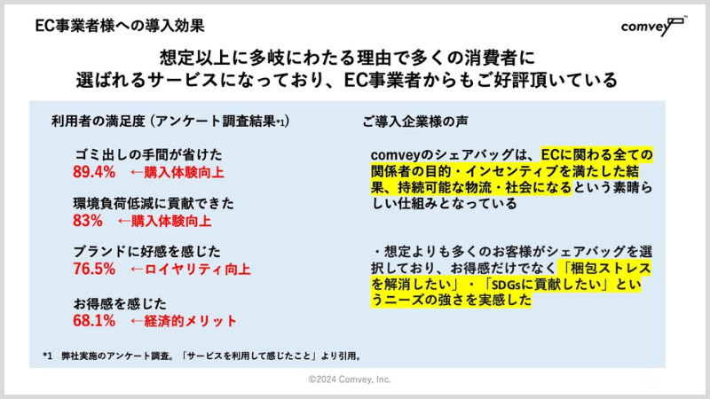 なぜかと言うと、まずEC事業者さんのオンラインストアにシステム連携できる利点があり、実行までスピード感を持って進められるからです。それに、消費者の方の手元にもcomveyのマイページがあるので、買い手側の動きも分析することができます。そのため、まずは『シェアバッグ』で梱包ゴミの問題にアプローチするのが一番良いと考えたんです。