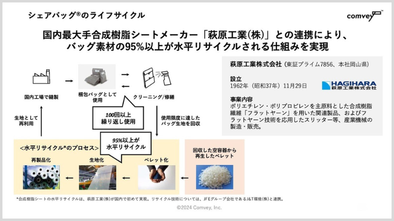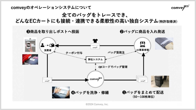 具体的には、サザビーリーグさんやアダストリアさんとの新しい連携です。これまでは消費者の方が返却した『シェアバッグ』は私たちcomveyの手元に戻ってきて、そこからクリーニングなどを行ない、再びEC事業者さんに納品していました。今回の取り組みでは、戻ってくるバッグの一部を、サザビーリーグさんやアダストリアさんの特例子会社宛に返却されるようにしています。
