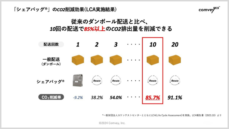 『シェアバッグ』にすることで、ダンボールと比較すると10回の配送で85%以上のCO2排出量を削減できる計算になります。この「85%以上削減」というのは一般社団法人カケンテストセンターさんと一緒に実施したLCA(※)の結果です。