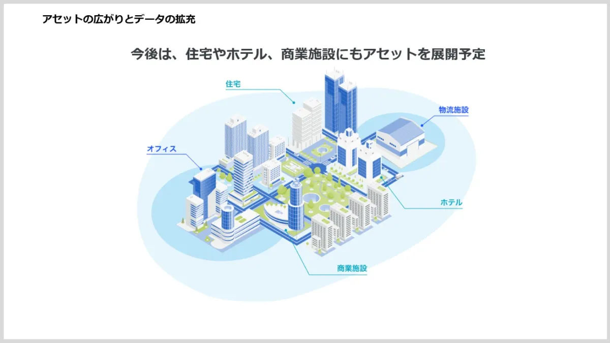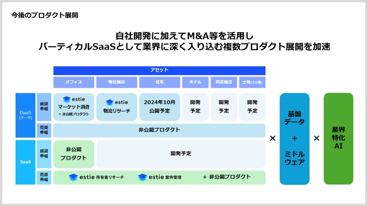 ひとつ目は、アセットの種類を広げるやり方です。最初のプロダクト「estie マーケット調査」はオフィスビルのデータベースでした。オフィスビルから物流施設にアセットの種類を広げ、2024年5月に公表したのが「estie 物流リサーチ」になります。将来的には、ショッピングモールやホテルなど、他のアセットに広げていきたいと考えています。