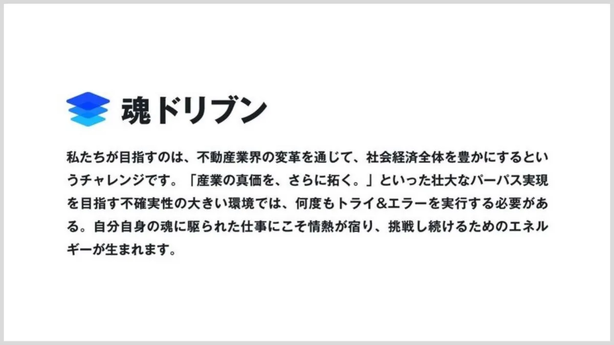 最近改めて会社のカルチャーを「Values」としてまとめ直したのですが、そのひとつ目に「魂ドリブン」というものを挙げています。僕たちは不動産業界の改革を通じて社会や経済を豊かにすることに挑戦しているわけですが、この基本的な方向性さえズレていなければ、あとは魂を燃やして仕事に取り組める人にどんどん任せていくというものです。