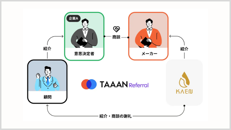 『TAAAN Referral』というプロダクトがあります。これは、『TAAAN』における法人の代理店が個人になったものです。個人が「顧問」のような位置付けになり、その方が保有す る人脈を活かしてメーカーに商談リードを提供し、商談が成立後に件数に応じた報酬が得られるモデルになります。