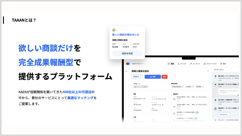 そういう方に営業することで、パートナーである代理店は複数の商談を獲得することができます。『TAAAN』の中で複数のメーカーに対して商談を提供すれば、これまでは1回の営業で1件の商談しか獲得できなかったところを、1回の営業で4件とか5件の商談を獲得できるようになります。パートナー側は生産性も売上も伸ばすことができます。こういった拡張性があることは、私たちのプラットフォームの特徴のひとつだと思います。
