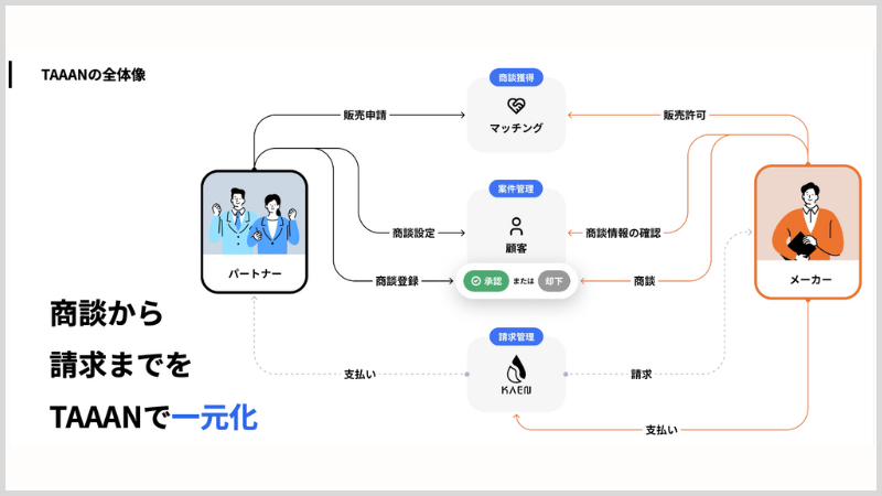 『TAAAN』はサービスを世の中に広めていきたいスタートアップと、お客様に喜んでいただける商材を販売したい法人の代理店をつなぐプラットフォームです。スタートアップのことを「メーカー」、法人代理店のことを「パートナー」とし、プラットフォーム内でマッチングしたらメーカーとパートナーのやり取りが始まります。