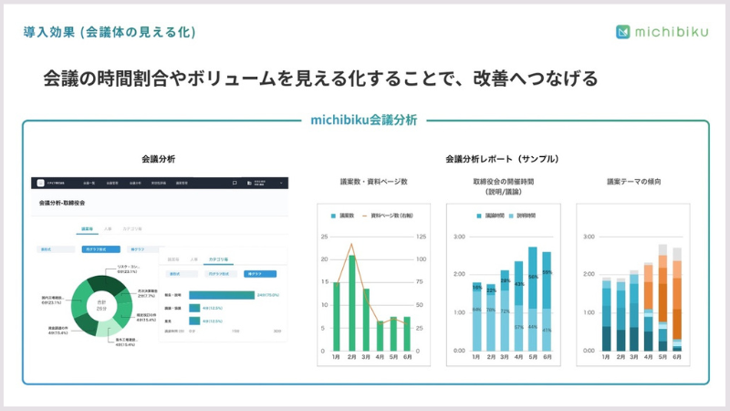 現状把握するために、『michibiku』の中には会議資料や当日の音声データなど、さまざまなデータをストックすることが可能です。それらを分析することで、取締役会で何にどれだけの時間が使われているのかを可視化することができます。議案ごと、参加者ごとに、どのように時間が使われたのかが可視化できますし、説明と議論の割合を出すことも可能です。