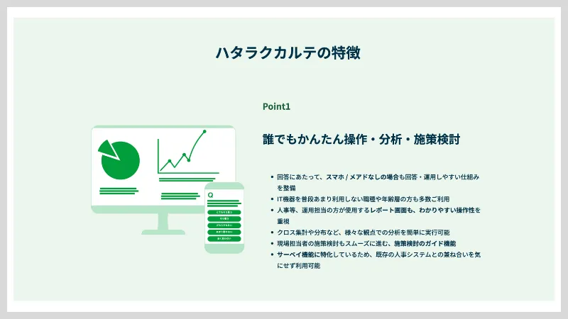 現状を把握するための仕組みをつくり、結果を分析しなければいけませんし、分析結果に基づいて改善するための戦略を立てなければいけません。たくさんの人事メンバーがいる大企業ならともかく、日本の企業の大半を占める中小企業にはそんなリソースがないことがほとんどです。そのため、現場の意見を効果的に収集でき、見える化するサービスとして「ハタラクカルテ」を研究開発したんです。