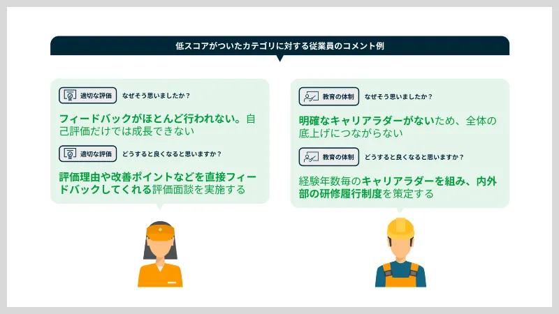 そして、絶対値に対して乖離の大きい結果になった際に「なぜそうなのですか?」と自動的に掘り下げていく機能があるんです。掘り下げていくことで、「⚪︎⚪︎があるからです」といった具体的なキーワードに当たることがあります。複数の方から同じキーワードが出てきた場合は、原因の特定がしやすくなり、結果として対策が立てられるようになります。