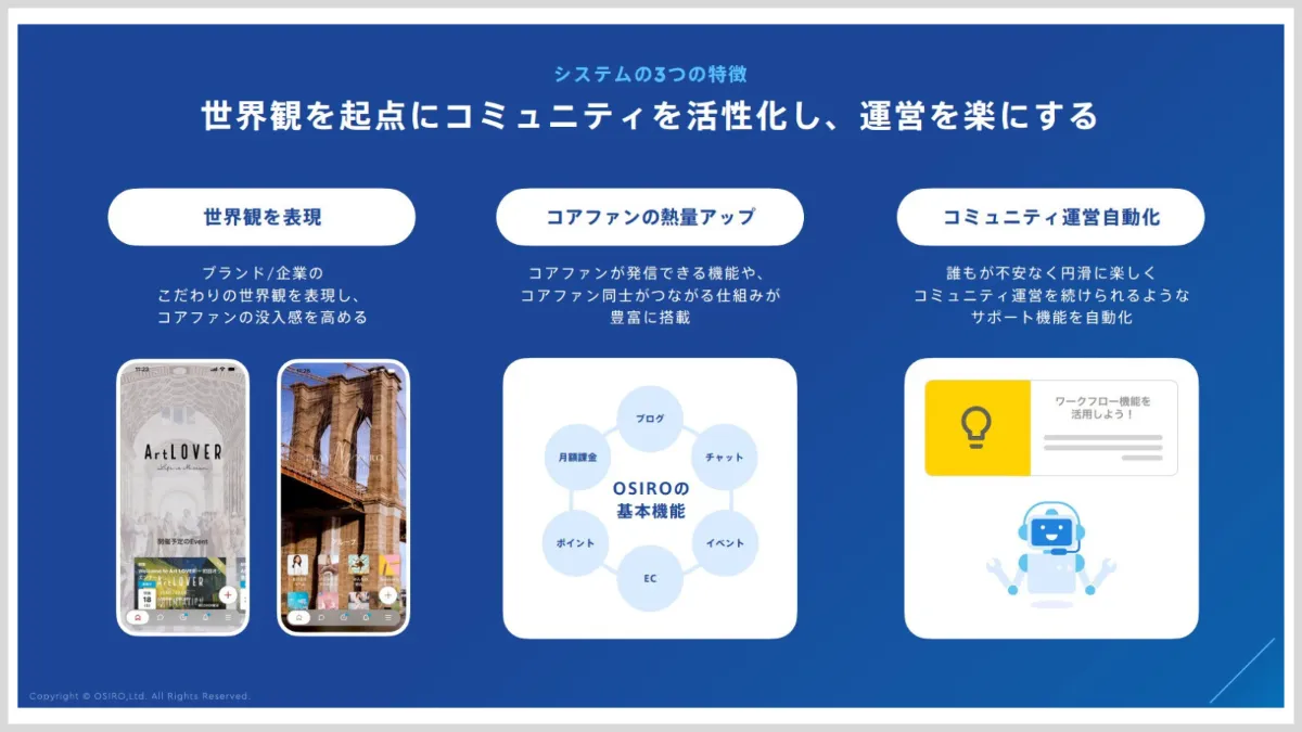 僕たちは人と人が仲良くなることの解明に挑戦していて、コミュニティ専用オウンドプラットフォーム「OSIRO」を通じて、機能というより、カルチャーを提供しているつもりです。コミュニティという言葉や存在を知っている人はたくさんいると思いますが、コミュニティが社会の中でどのような役割を果たすのかを考えたことがある人は多くはないのではないでしょうか。