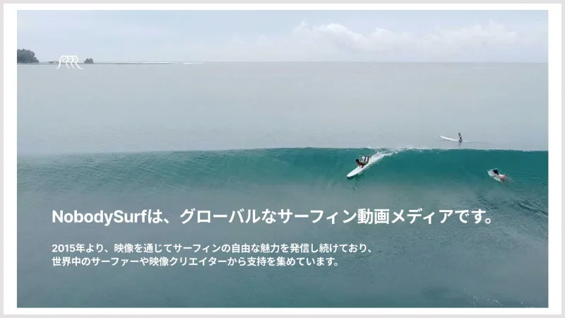 まず、私たちがやっているのは『NobodySurf』というサービスになります。簡単に言うと、グローバルなサーフィン動画メディアです。映像を通じて、サーフィンの自由さとか、魅力を伝えていくっていうのがミッションです。