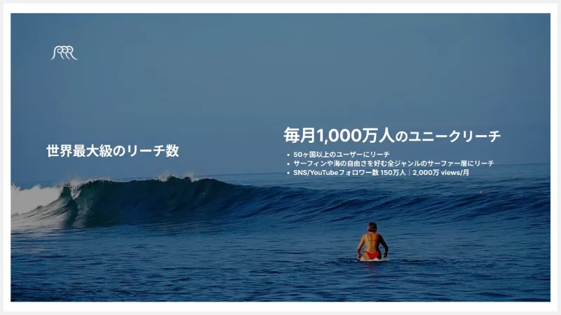 わかりやすいところだと、たとえば自動車メーカーさんや飲料メーカーさん。あとは旅行系の企業であったりとか政府や行政の観光局など。そういったところと組むことができれば、サーフィンの映像を通じてクライアントの新しい魅力をアピールできるかもしれないですし、サーフィン映像のクリエイターにしっかりとお金を還元できるようになり、私たちも事業の柱を増やすことができるはずです。