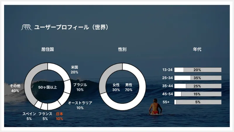 最初からこのスタンスで『NobodySurf』をやってきて、いまでは50ヶ国以上のサーファーが毎月私たちのサービスを使ってくれるようになりました。ユーザーの地域ごとの内訳を見てみると、アメリカが20%、ブラジルとオーストラリアと日本が10%ずつ、そのあとにフランスやスペインが5%で続き、その他が40%となっています。
