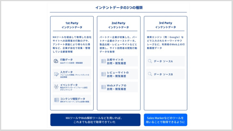 まずはデータ取得の壁です。インテントデータが取得できるプロバイダーが限られているため、そもそものデータを取得することが困難でした。インテントデータには大きく3つの種類があり、顧客のニーズを把握するのに最も効果的なものが「3rd party インテントデータ」です。