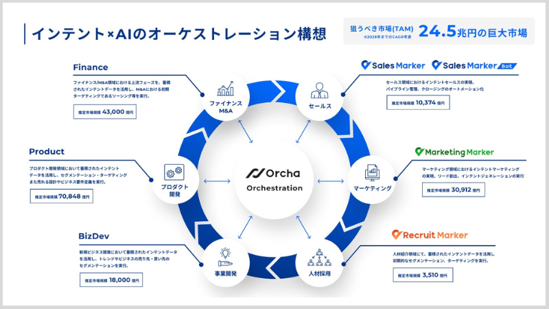 『Orcha』はAIスーパーエージェントで、事業を構成するさまざまな機能の中心という位置付けです。つまり、『Orcha』に依頼をすることで、『Sales Marker』や『Marketing Marker』に適切な指示を出し、課題を解決するためのHowを返してくれるという仕組みです。