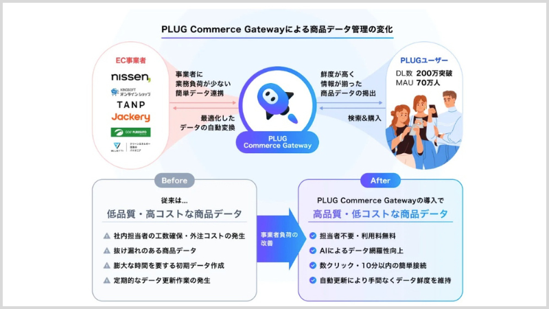 ちなみに、2025年10月リリースのEC事業者向けサービス『PLUG Commerce Gateway』では、事業者側が持つ商品データをAIで整理し、『PLUG』とスムーズなデータ連携が可能になります。提携サービスが増えるほど、事業者側には商品情報をつくったり在庫情報を更新するといった工数が発生していましたが、その課題を解決するサービスです。