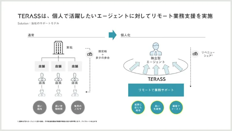 不動産仲介をする場合、会社員として働くか、個人で独立するか、これまではふたつの選択肢しかありませんでした。そこに、私たちのサポートを受けながら独立型の不動産エージェントとして働くという「第3の選択肢」を提供したんです。