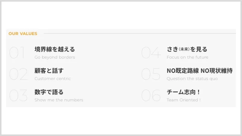 価値観としては、会社のVALUEとしてまとめているものが6つあります。どれも大切なのですが、中でもよく口にするのは『境界線を越える』でしょうか。