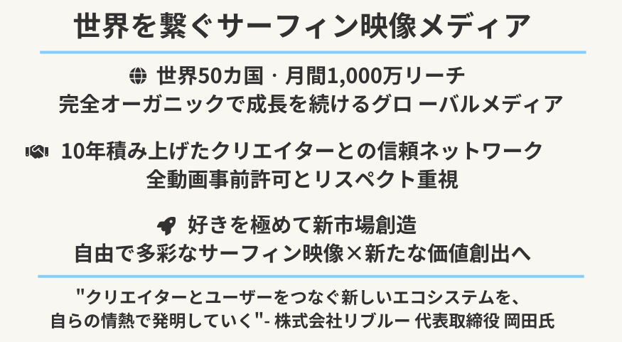 10年かけて築き上げた「グローバルなサーフィン動画メディア」のブランドを胸に、外に広がる大海を目指すリブルー岡田の成長戦略とは。メディア・エンタメ意思決定プラットフォーム戦略アライアンス経営哲学Recommender杉山博一オシロ株式会社 代表取締役社長2025.04.10 公開