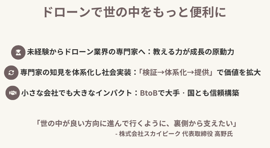 経営経験も専門知識もないなかで任された代表の役割。「検証・体系化・提供」のプロセスでドローンの社会実装を目指す高野の、裏方の哲学。物流・インフラ社会実装公共性倫理と責任リーダーシップRecommender髙地 耕平株式会社EXPACT 代表取締役2025.07.31 公開