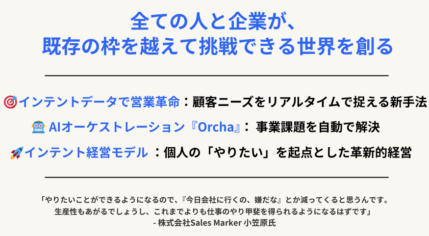 T2D3の倍の速度で事業を成長させるSales Marker小笠原。彼が描く、インテント経営モデルによりウェルビーイングが実現した世界とは。ビジネス支援・公共データ利活用産業変革意思決定リーダーシップRecommender百合本 安彦グローバル・ブレイン株式会社 代表取締役社長2025.10.08 公開