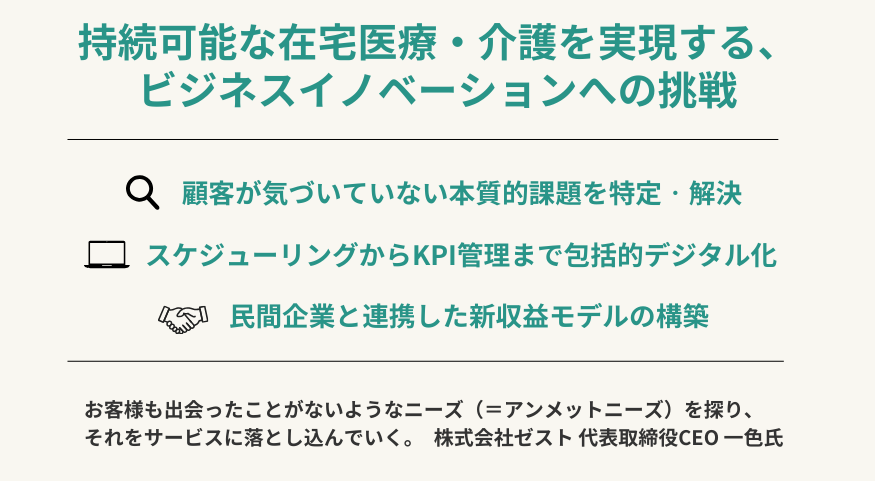 外資企業でマーケティング、コンサル会社で企業再生。結果を残してきた一色が次に選んだのは在宅医療・介護領域。目指すのは、社会的意義と事業の持続性が両立する未来。医療・ヘルスケア公共性AI・アルゴリズムサステナビリティ経営哲学Recommender吉村 英毅株式会社ミダスキャピタル 代表パートナー2025.08.28 公開