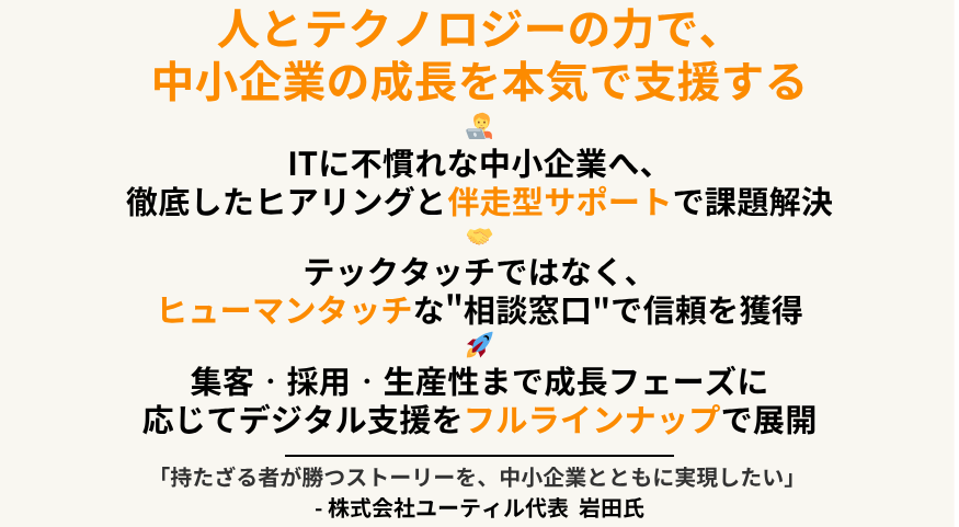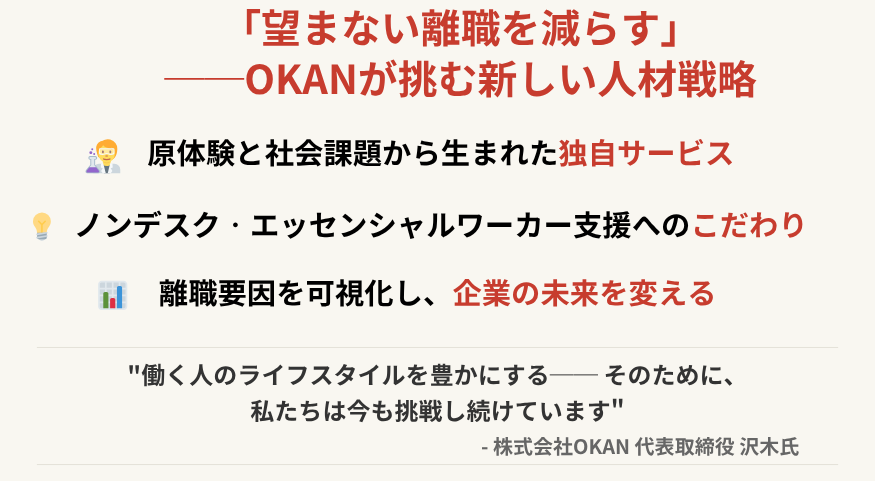 「働けなくなる要因を見つけて解決する」を事業にしたOKAN沢木。離職から逆算し人材戦略を考える独自アプローチで、労働力人口減少という社会課題の解決に挑戦中。教育・人材人材戦略ウェルビーイング経営哲学社会実装Recommender岩田真株式会社ユーティル 代表取締役2024.12.12 公開