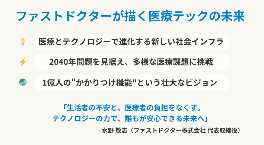 「生活者の不安と、医療者の負担をなくす」。掲げたミッションの具現化に執着し続ける、ファストドクター水野敬志の愚直な日々。医療・ヘルスケア構造改革DX公共性プラットフォーム戦略Recommender白砂なぎさ RPO事業代表2024.07.31 公開
