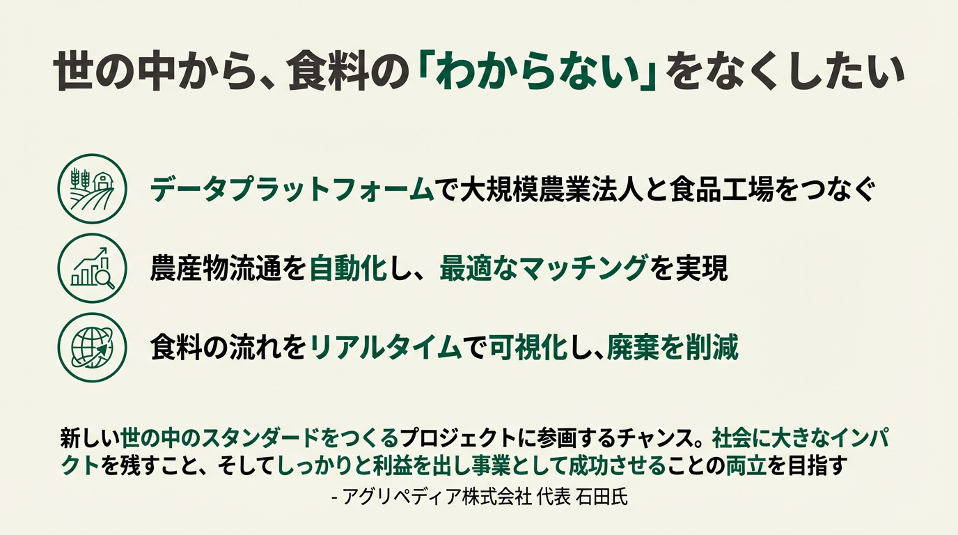 東大入学式の翌日から大学には行かず農業の世界へ。アグリぺディア石田が描く「メガファーム構想」は日本の農業を変えるのか。農業・食産業変革事業ピボット構造改革公共性Recommender山田 優大PARTNERS FUND 代表パートナー2026.02.26 公開