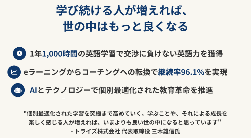 孫正義の鞄持ち時代の挫折が英語学習の原点に。コーチングモデルで革命を起こしたトライズ三木が語る、学びの力。教育・人材意思決定価値観の転換AI・アルゴリズム経営哲学Recommender樋田かおり株式会社トークナビ 代表取締役2025.11.09 公開