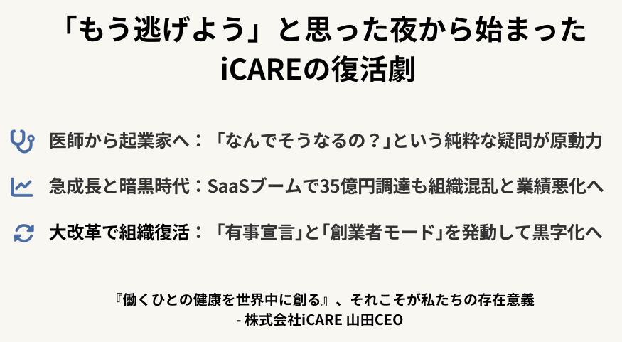 もう逃げよう───諦めかけたiCARE山田は、事業を立て直し、データを軸に新たな挑戦を続けている。彼を支えた信念と、彼が実現したい未来とは。医療・ヘルスケア事業ピボットハードシングス倫理と責任公共性Recommender和田圭祐インキュベントファンド株式会社 代表パートナー2025.09.29 公開