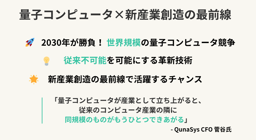 2030年をゴールに国際競争が続く量子の分野。日本発スタートアップQunaSysが描く世界での勝ち筋。そして、いまだからこそ得られるキャリアの魅力とは。IT・テクノロジー産業変革市場創造AI・アルゴリズムアライアンスRecommender桑原優樹JICベンチャー・グロース・インベストメンツ株式会社 ベンチャーキャピタリスト2025.03.27 公開