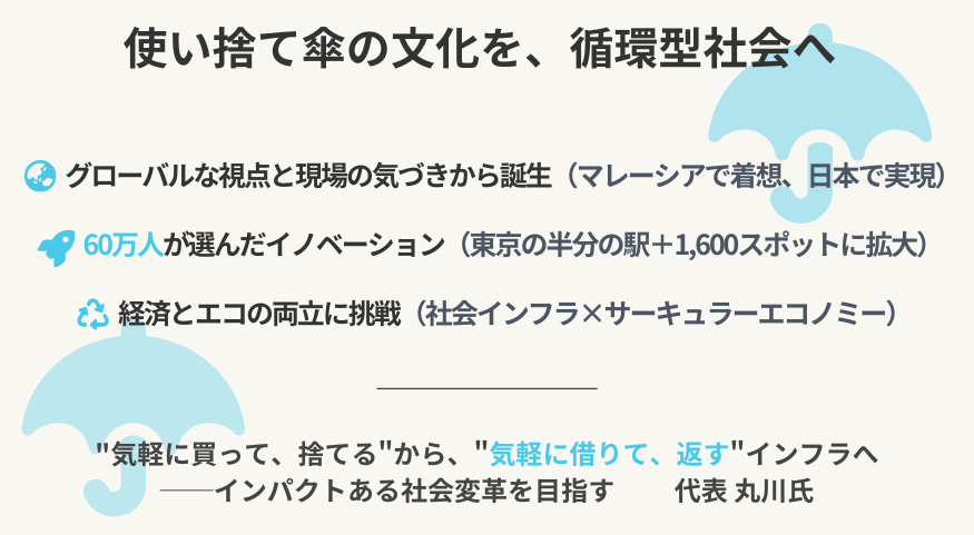傘のシェアリングサービスで「経済とエコは両立できる」の証明に挑戦する丸川。まず目指すのは、年間8,000万本のビニール傘消費量をゼロにすること。物流・インフラ循環型社会アライアンス社会実装ハードシングスRecommender家本賢太郎チャリチャリ株式会社 代表取締役社長2024.10.29 公開