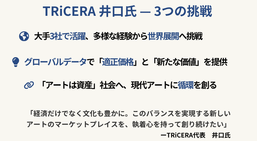 アートが廻る。正しく世の中をめぐる。そんな世界を創るために。グローバル企業を飛び出し、トライセラを立ち上げた井口泰。その背景とこれから。メディア・エンタメ市場創造プラットフォーム戦略エコシステム起業家精神Recommender渡邉佑規KUSABI代表パートナー2024.07.31 公開