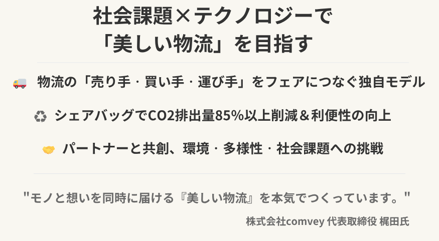 総合商社時代、物流の課題を実感した梶田。売り手・買い手・運び手の関係性を向上させる仕組みと信頼できるパートナーと共に、社会課題の解決に挑む。物流・インフラ公共性構造改革アライアンスサステナビリティRecommender岡田英之株式会社リブルー 代表取締役2025.06.29 公開