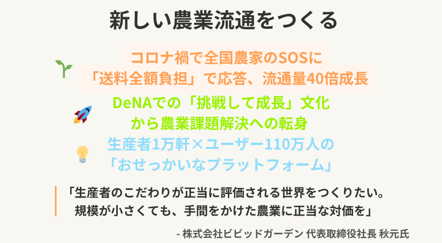 コロナ禍。全国からのSOS。対応するほど膨らむ赤字。資金ショートの危機。すべてを乗り越えたビビッドガーデン秋元の、決断の核にあったもの。農業・食構造改革市場創造公共性ハードシングスRecommender大平裕介株式会社Leaner Technologies 代表取締役2025.03.02 公開