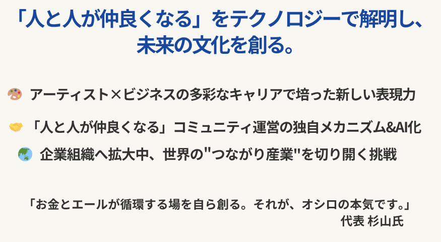 8年間の孤独を原体験に、コミュニティサービスの開発を進めてきたオシロ杉山。見えてきたのは「人と人が仲良くなる」ことが持つ大きな大きな可能性。ライフスタイル市場創造エコシステムヒューマンタッチAI・アルゴリズムRecommender佐渡島庸平株式会社コルク 代表取締役社長2024.11.25 公開
