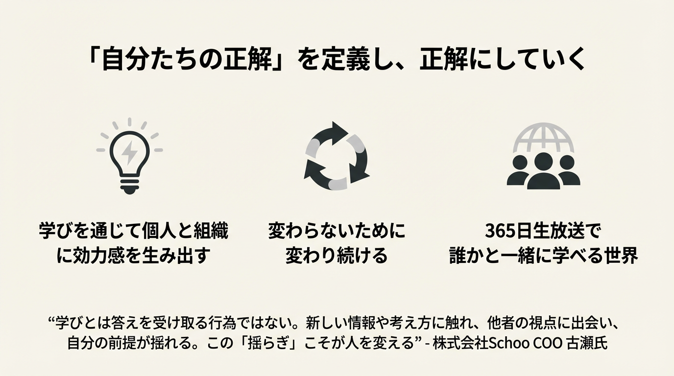 正解のないこの時代に、「学び」と「実行」で正解をつくり続ける──Schoo COO古瀬康介の経営哲学。教育・人材プラットフォーム戦略価値観の転換企業文化経営哲学Recommender篠﨑 新悟株式会社よりそう 代表取締役社長COO2026.03.05 公開