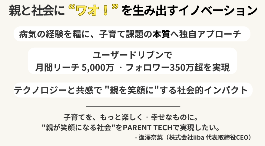 実感した「こんなはずじゃなかった」という子育ての現実を「やって良かった」に変えたい。テクノロジーを活用して子育ての不便解消を目指す逢澤の挑戦。ライフスタイル価値観の転換市場創造公共性アライアンスRecommender丸川照司株式会社Nature Innovation Group 代表取締役2025.04.03 公開